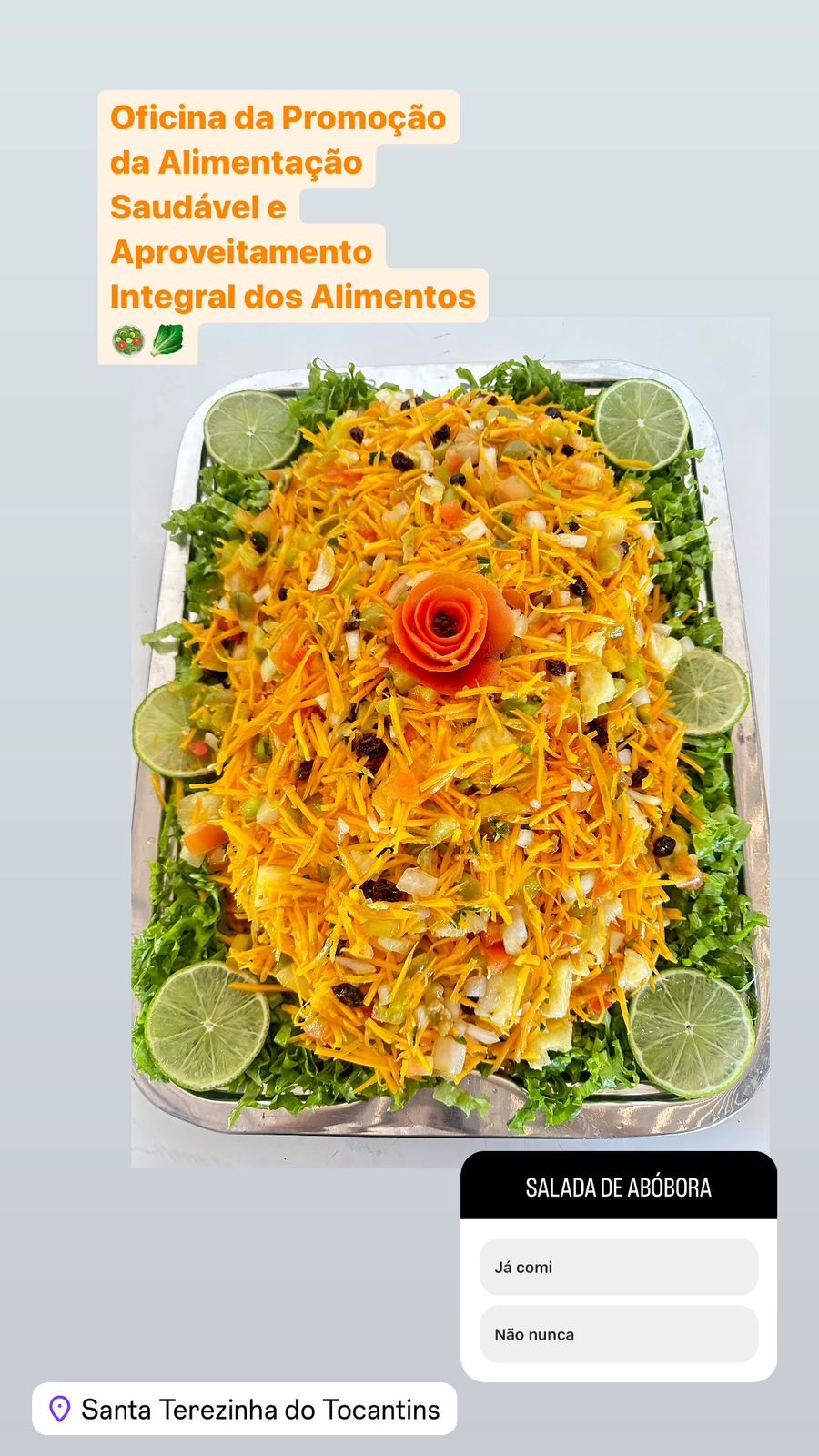 Nos dias 04 e 05 de junho de 2024, no Centro de Convivência Social, a Prefeitura Municipal de Santa Terezinha do Tocantins, através do CRAS e Secretaria Municipal de Assistência Social em parceria com Governo Federal, Governo do Estado do Tocantins, Secretaria do Trabalho e Desenvolvimento Social do Tocantins, promoveram a Oficina de Promoção da Alimentação Saudável e Aproveitamento Integral dos Alimentos, o objetivo da capacitação é estimular a adoção de hábitos alimentares saudáveis, promovendo a produção e o consumo de alimentos regionais para enriquecer a alimentação da população, também visa conscientizar sobre aspectos higiênicos, sanitários, ambientais e culturais, bem como evitar o desperdício de alimentos, contribuindo assim para a redução do índice de Insegurança Alimentar e Nutricional e a melhoria da qualidade de vida das pessoas.